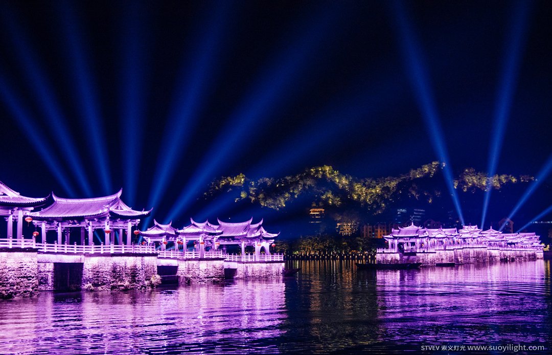 广济桥最美的时候是在晚上,这也是国内最独特的一场灯光秀。依托中国四大古桥之一的广济桥、廿四楼台廿四样,结合音乐、投影、山体的大型户外灯光秀。完美展现了一个城市的文化内涵,塑造了城市的美好形象,同时赋予了城市新的活力,也同步迅速拉动城市夜间经济的发展。演绎了舞台灯光与景观亮化的跨界融合。